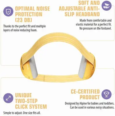 Gule Muffy øreklokker fra Alpine med et polstret bånd. De har skumvatterte deksler. Barn har mer sensitiv hørsel enn voksne og er sensitive mot høye lyder, derfor er det ekstra viktig å beskytte hørselen deres. Perfekt for konserter, fornøyelsesparker eller i fly! – Anbefalt alder: fra nyfødt til 2 år.