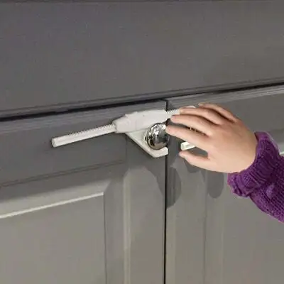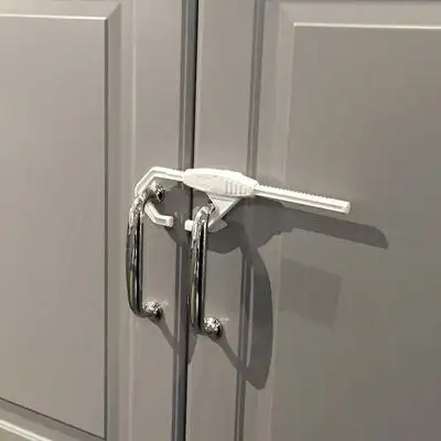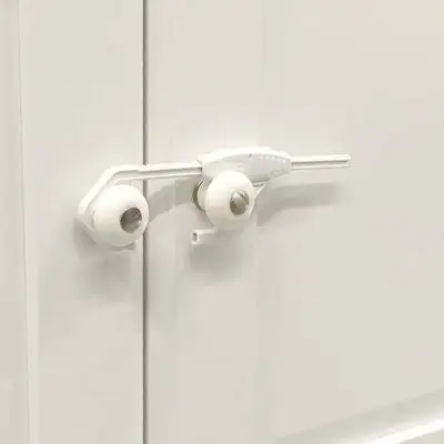 Gjør hjemmet ditt barnesikkert med doble skaplås fra BabyDan. Låsen forhindrer barn fra å åpne skap som inneholder ting som kan være farlige for dem. Monteres kjapt og enkelt på to skapdører som har hvert sitt håndtak. Laget av plast.
