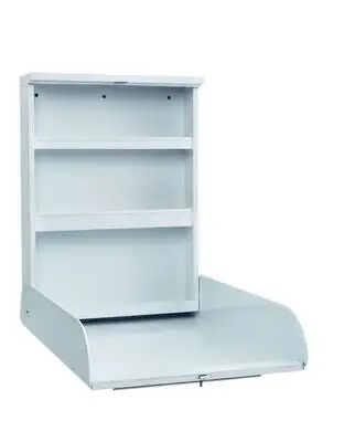 BabyDan Veggstellebord Metall Alfred Hvit er et praktisk stellebord til å feste på veggen, laget av robust og stabilt metall. Stellebordet er den ideale løsningen for det lille hjemmet eller badet ettersom den opptar liten plass og sparer gulvplass. Stelledelen åpnes enkelt og foldes ut. En sikkerhetsperre gjør at veggstellebordet ikke kan falle ned av uhell. Godkjent i henhold til EU standard. Stellebordet har praktiske hyller til å oppbevare bleier, våtservietter, babyolje, ekstra klær og andre nødvendigheter. Match gjerne med BabyDan Stellematte Soft til Veggstellebordet. En stellematte som passer veggstellebordet Alfred og Karla fra BabyDan, se under tilbehør.Mål: H 80 x B 58 X D17 cm Maksimal belastning: 11 kg.Materiale: Metall.Farge: Hvit.OBS! Skruer til å henge opp veggstellebordet inngår ikke.