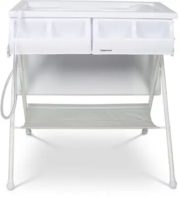 Dette stellebordet fra Beemoo Care er en smart 2-i-1-løsning som inneholder både stellebord og badebalje.Du kan enkelt bytte om mellom stellebord og balje ved å felle ned stellematten så den henger på siden av stellebordet under tiden som ditt barn bader. Badebaljen er utstyr med en tappeslange for at du enkelt skal kunne tømme ut vannet i vasken, badekaret eller gulvsluket. På siden av bordet finnes det fire praktiske lommer for oppbevaring av bleier, kluter, hygieneartikler og andre nødvendigheter. Under bordet finnes det en større oppbevaringsflate.Stellebordet er utrolig praktisk for hjem med lite plass eller på hytta fordi det enkelt kan felles sammen med de kryssende beina.