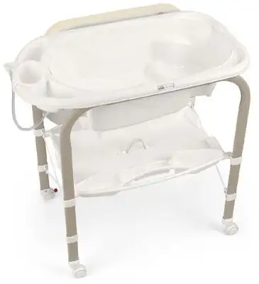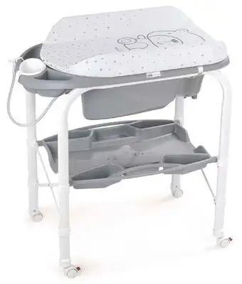 Et praktisk stellebord med badebalje, fra CAM, perfekt for deg som har et lite bad. Badebalja kan enkelt tas av, og det er flere praktiske oppbevaringsrom til dusjtilbehør og lignende. Badebaljen har to anatomisk formede anti-glide-innlegg, en tilbakelent sete for barn i alderen 0-6 måneder, og et sete med armlener, for barn i alderen 6-12 måneder. Badebaljen har tappeslange for enkel tømming i vasken, badekar eller gulvsluk. Du kan enkelt bytte mellom badebalje og stellebord ved å ta bort stelledelen. Stellematten er myk og deilig å ligge på, og har et dråpeformet system, som gjør at fuktighet ikke trenger gjennom.Stellebordet har firehjul, så det er enkelt å flytte rundt. Bremser sikrer at bordet står trygt på plass. Når du er ferdig, klapper du enkelt sammen badekarsstellebordet ved å ta bort badebaljen og dra i håndtaket i midten av oppbevaringsplassen. Sammenklappingen er enkel og kan gjøres med én hånd I sammenklappet form er bordet kompakt og enkelt å oppbevare, også i mindre baderom.Alle materialer er gift- og ftalatfrie. Anbefalt alder: 0-12 måneder.