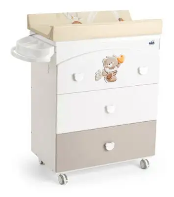 En fin stellekommode i moderne og stilsikkert design med bjørnemotiv og lekefulle håndtak til skuffene. Kommoden har tre skuffer med metallskinner og ekstra oppbevaringsplass. En romslig badeplass med to ulike badeseter er tilgjengelig – en tilbakebøyd for babyen opp til 6 måneder, og en mer oppreist for barnet som er mellom 6 til 12 måneder. Badeplassen har en dreneringsfunksjon med plugg for enkel vanntømming. En myk stellematte med et herlig mønster som fanger barnet ditt sin interesse under bleiebytte inngår også. Kommoden er utstyrt med fire hjul der to av de har bremser.