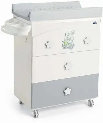 En fin stellekommode i moderne og stilsikkert design med kaninmotiv og lekefulle håndtak til skuffene. Kommoden har tre skuffer med metallskinner og ekstra oppbevaringsplass. En romslig badeplass med to ulike badeseter er tilgjengelig – en tilbakebøyd for babyen opp til 6 måneder, og en mer oppreist for barnet som er mellom 6 til 12 måneder. Badeplassen har en dreneringsfunksjon med plugg for enkel vanntømming. En myk stellematte med et herlig mønster som fanger barnet ditt sin interesse under bleiebytte inngår også. Kommoden er utstyrt med fire hjul der to av de har bremser.