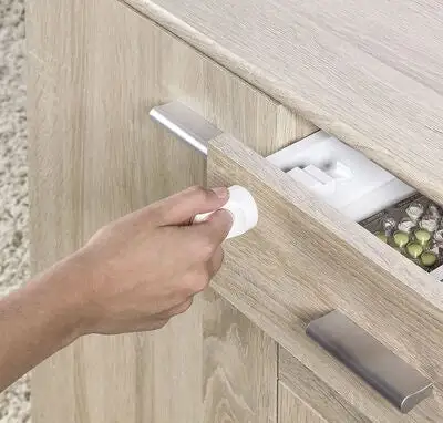 Hold nysgjerrige, små hender borte fra farlige verktøy og skarpe bestikk med en magnetlås fra Safe & Care. Festes enkelt på innsiden av skuffen, slik at den forhindrer at barnet ditt åpner den uten tillatelse. Kan brukes på skuffer som er minst 6 cm brede, og har en side som er minst 7 cm lavere en forsiden. Magnetlåsen fungerer på skuffer som er opptil 3 cm tykke. Les de medfølgende instruksjonene nøye for å forsikre dere om at alt er korrekt montert!